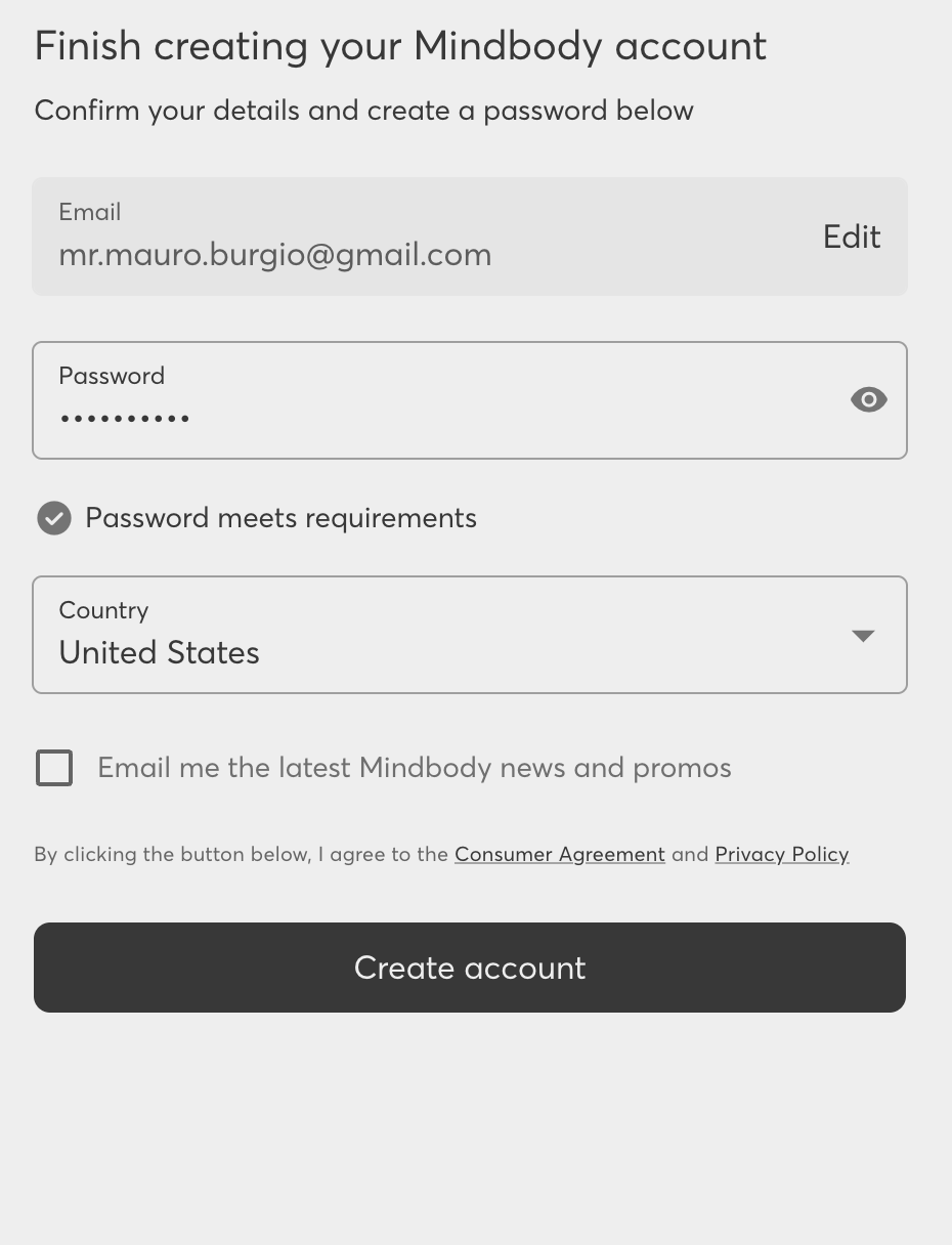 If you have not created a MindBody Account, you will be asked to create one at this time.