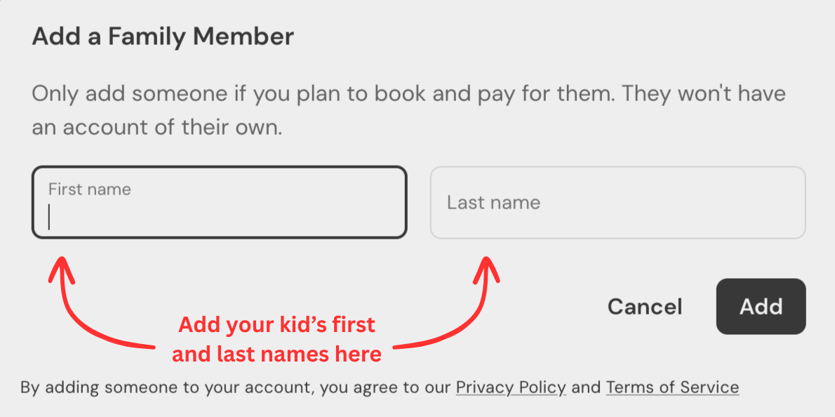 Step 5: Once you enter your child’s first and last name, click “Add” and you will be taken back to your account page where you will see your child in the Family section.