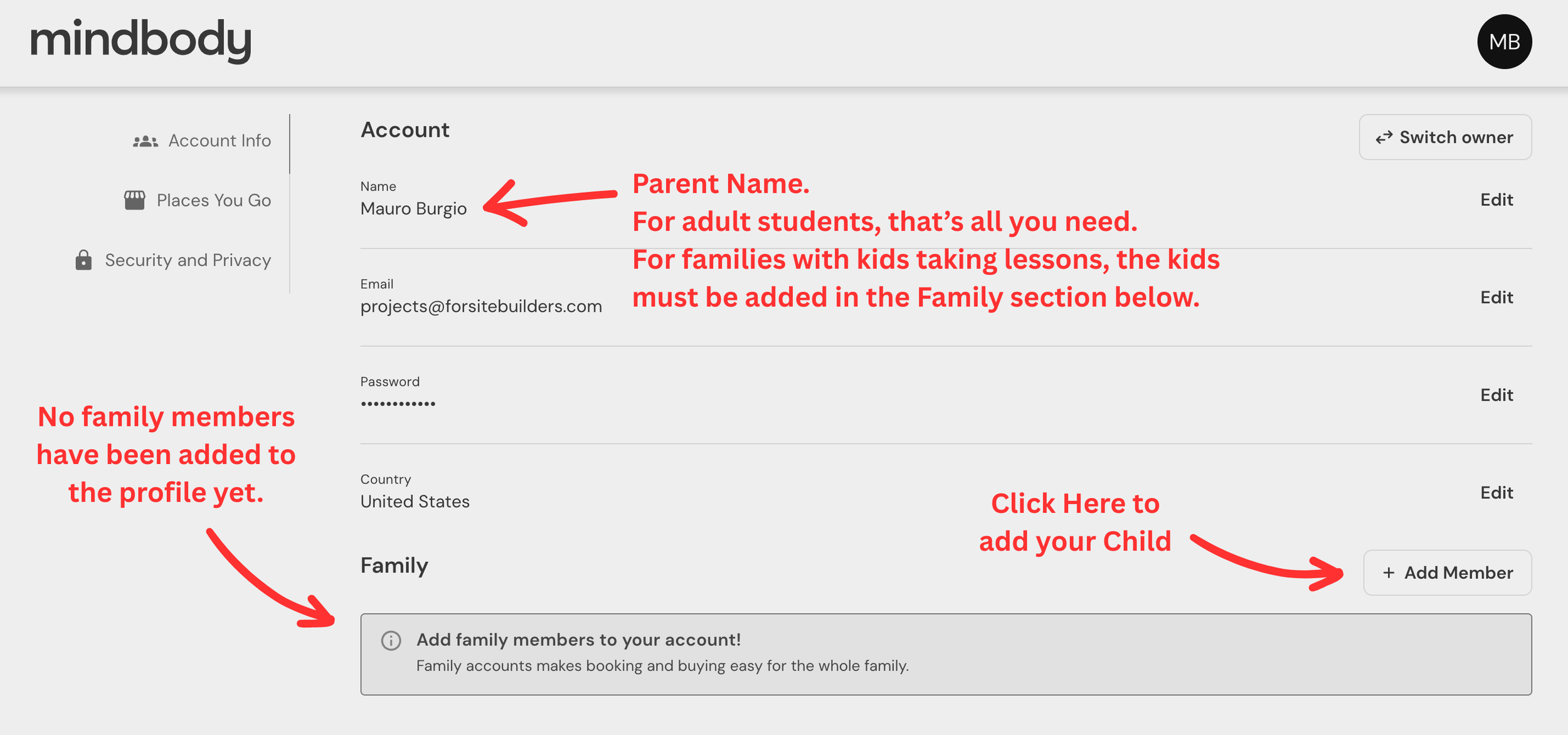 Step 3: Once you log into MindBody, you will be taken to your account page where you can add family members: